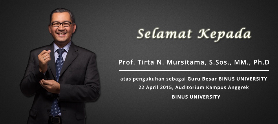 Pelantikan Prof. Tirta semakin mempertegas langkah BINUS UNIVERSITY dalam memberikan pendidikan terbaik menuju cita-cita universitas kelas dunia, sesuai dengan visinya ?A World-class university, in continuous pursuit of innovation and enterprise?. Prof. Tirta adalah sosok yang sejak awal didaulat untuk membangun program studi hubungan internasional di BINUS UNIVERSITY, dan kini menjabat sebagai Head of Department, International Department. Mari kita mengenal lebih dekat sosok Tirta, dari seorang anak PNS bisa menjadi seorang Guru Besar.