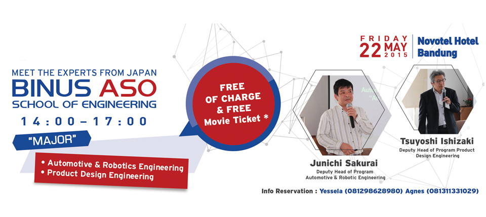 Meet The Experts From Japan Featured BINUS ASO School of Engineering Proudly Presents : Meet the Experts From Japan May 22, 2015 (Friday) 02.00pm – 05.00pm Novotel Hotel, Bandung West Java Info Reservation : Yassela : 0812 9862 8980 Agnes : 0813 1133 1029 Share It :