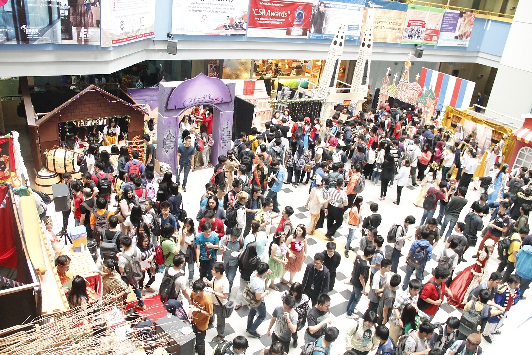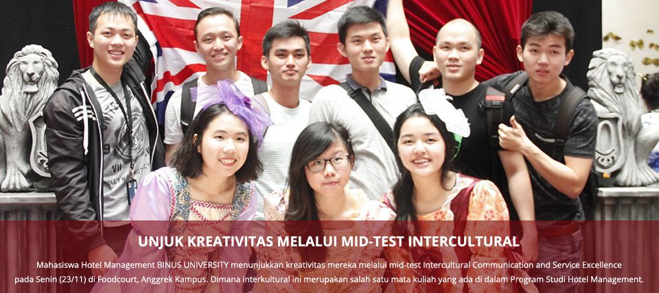 Mahasiswa Hotel Management BINUS UNIVERSITY menunjukkan kreativitas mereka melalui mid-test Intercultural Communication and Service Excellence pada Senin (23/11) di Foodcourt, Anggrek Kampus. Dimana interkultural ini merupakan salah satu mata kuliah yang ada di dalam Program Studi Hotel Management.