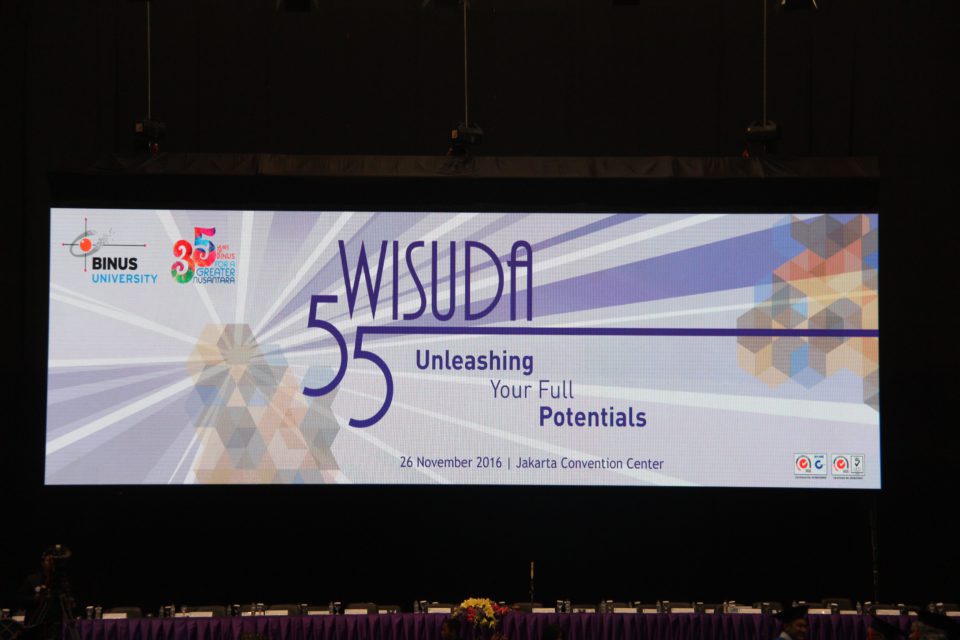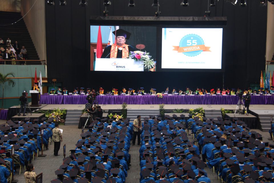 Tepat pada tanggal 26 November 2016 kemarin, BINUS melantik 3.356 wisudawan dan wisudawati di Jakarta Convention Center (JCC), Senayan, yang merupakan acara wisuda yang ke 55. Acara wisuda ini dibagi menjadi 3 sesi. Sesi pertama dimulai pukul 07.00-11.00, sesi kedua dimulai pukul 12.30 – 15.00 dan sesi ketiga dimulai pukul 15.45 sampai 18.15.