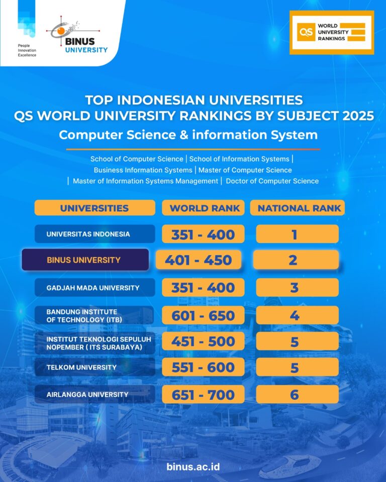 BINUS University kembali mencetak prestasinya pada QS World University Rankings by Subject 2025 untuk bidang Computer Science & Information Systems, tahun ini BINUS University berada di peringkat 401-450 secara global dan menempati posisi kedua terbaik di Indonesia.