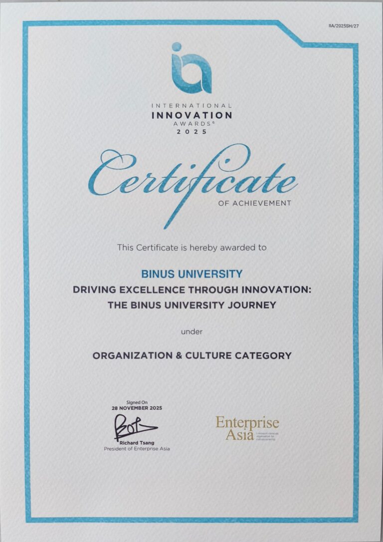 International Innovation Award adalah ajang penghargaan bergengsi tingkat dunia yang mengakui dan menghargai inovasi luar biasa yang dilakukan oleh perusahaan, organisasi, dan individu dari berbagai sektor. Dikelola oleh Enterprise Asia, penghargaan ini menjadi tolok ukur global bagi praktik terbaik dalam manajemen inovasi, yang mencakup aspek produk, layanan, dan yang paling krusial, budaya dan organisasi. Memenangkan penghargaan ini adalah simbol pengakuan internasional atas kepemimpinan visioner, komitmen terhadap inovasi berkelanjutan, dan keberhasilan dalam menciptakan dampak transformasional. Komitmen jangka panjang BINUS University terhadap keunggulan organisasi berhasil menarik perhatian juri internasional.