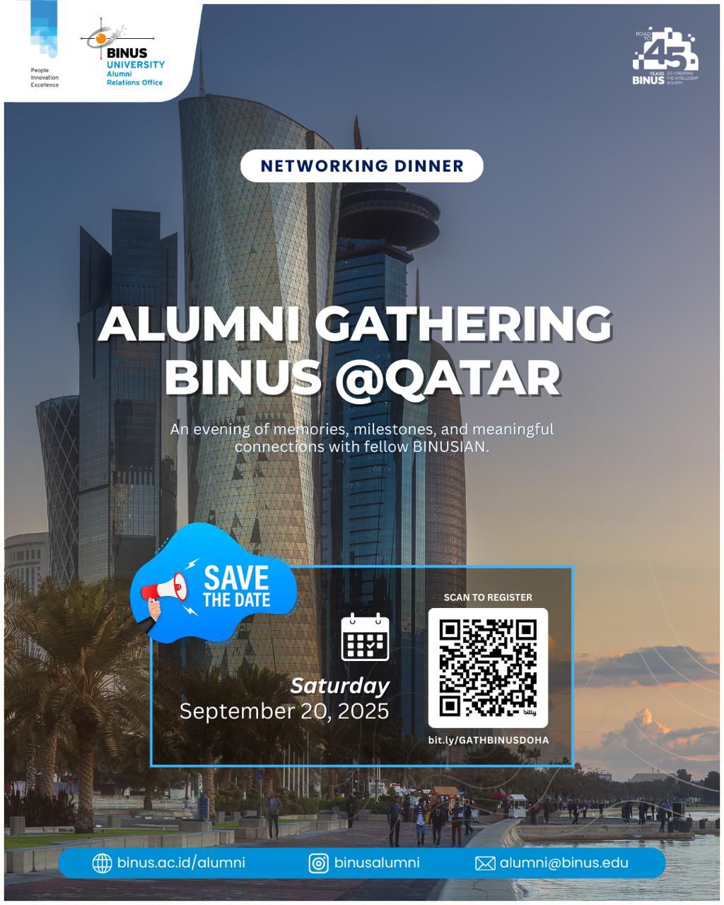 Saatnya kita kembali berkumpul dalam suasana penuh kehangatan, networking, dan cerita seru di *Alumni Gathering BINUS Doha – Qatar* ??