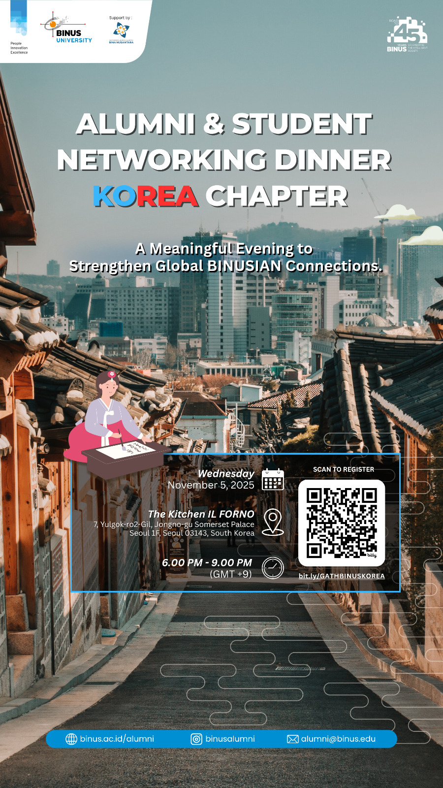 Jangan lewatkan kesempatan istimewa ini — Mari hadir, bernostalgia, dan bersama-sama menciptakan kembali memori untuk komunitas alumni BINUS di Korea!