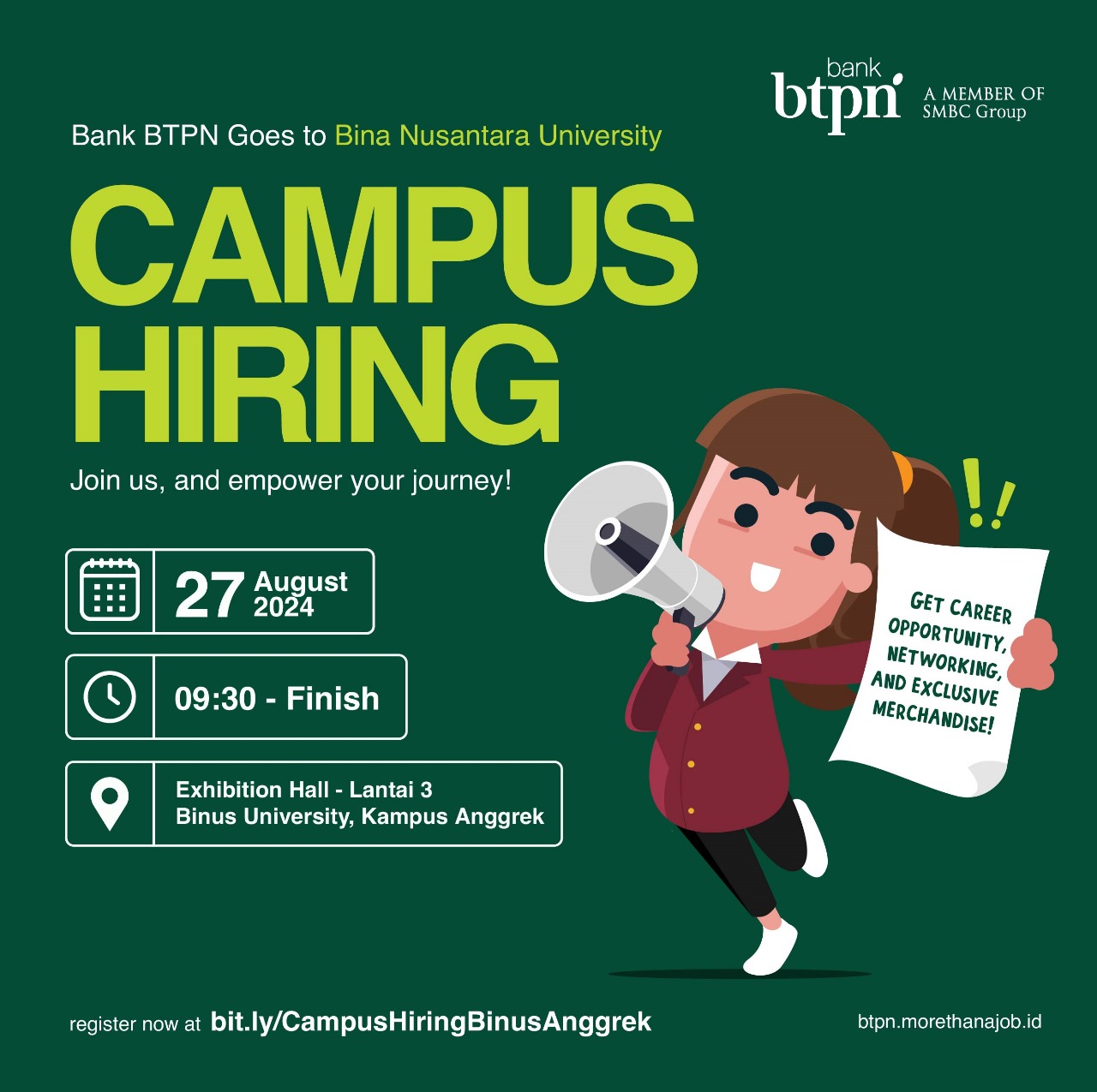 #ARO #AlumniRelationOffice #BINUSIAN #BINUSAlumni #CampusHiring #BankBTPN #ManagementTrainee #LEADProgram #Binusian #CareerOpportunities #JobFair #BTPNLead #CampusEvent #HiringEvent #FreshGraduate #InnovativeCareers #CreativeCareers #BinusUniversity #ExhibitionHall