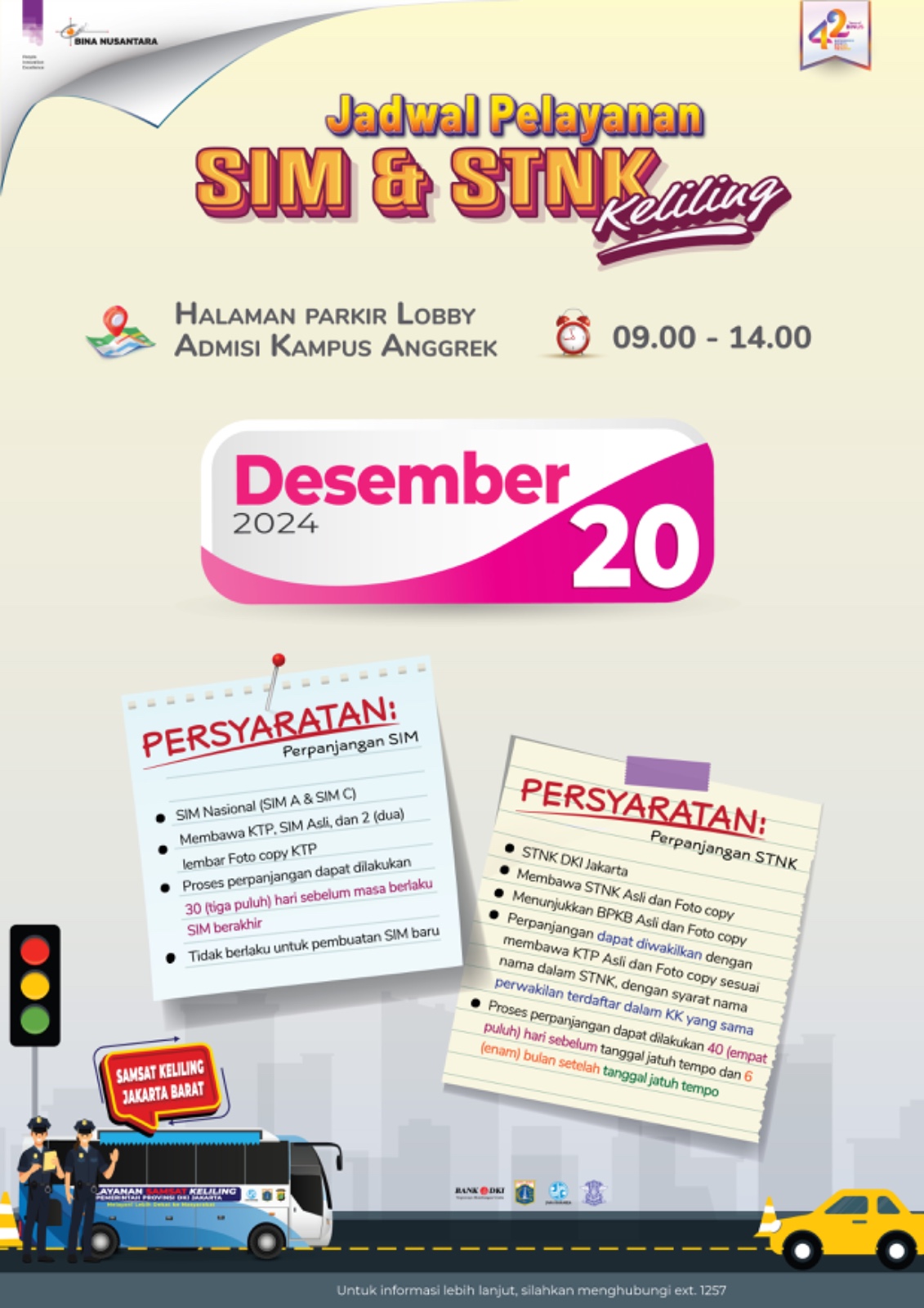 Kami mengundang Anda untuk memperpanjang SIM (A/C) dan melakukan pembayaran pajak kendaraan bermotor (STNK DKI) di Lobi Admisi dan halaman parkir Kampus Anggrek.