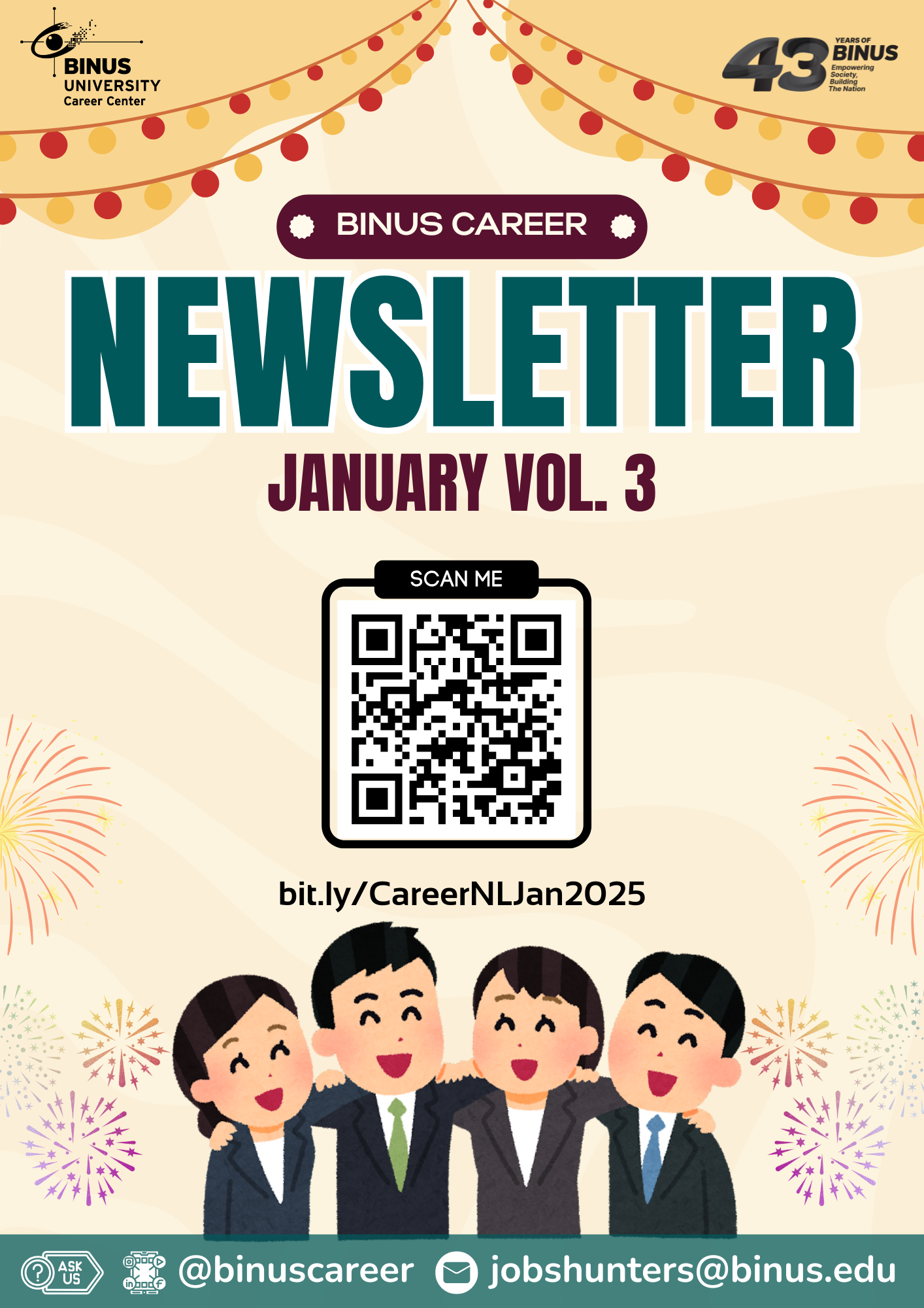 Newsletter by BINUS CAREER bulan January Volume 3 sudah terbit !! Banyak lowongan yang siap kalian jelajahi. Ayo segera cek newsletternya, segera siapkan CV terbaikmu dan daftarkan diri kamu !!