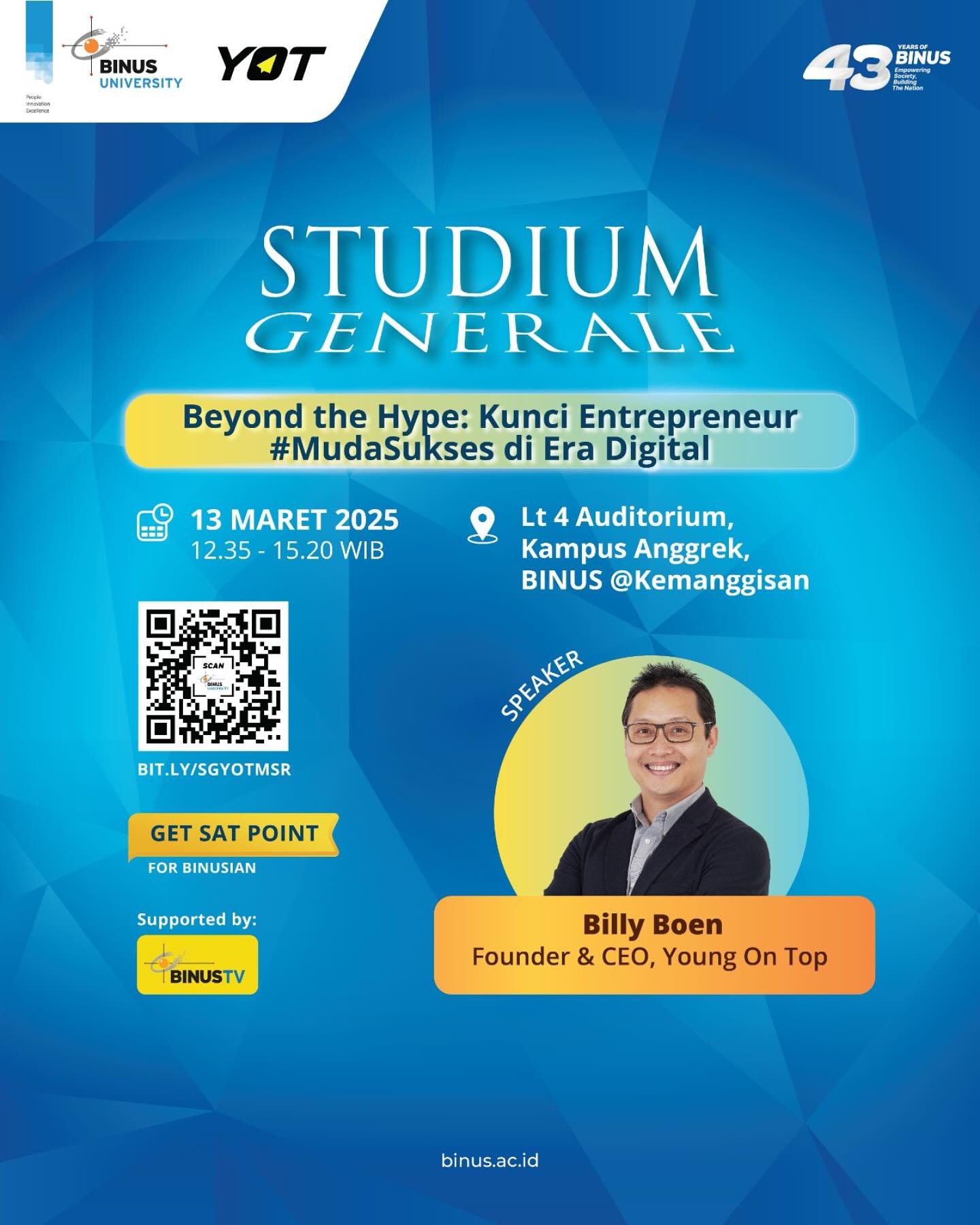 STUDIUM GENERALE BINUS UNIVERSITY x YOUNG ON TOP @youngontop menghadirkan @billyboenyot selaku Founder & CEO Young On Top yang akan membongkar rahasia jadi entrepreneur muda sukses di era digital!