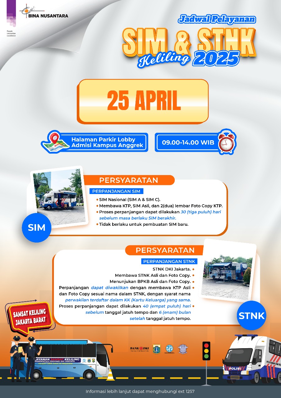 Hadir kembali di Bulan April ini, Layanan SIM dan STNK Keliling di Kampus BINUS Anggrek.