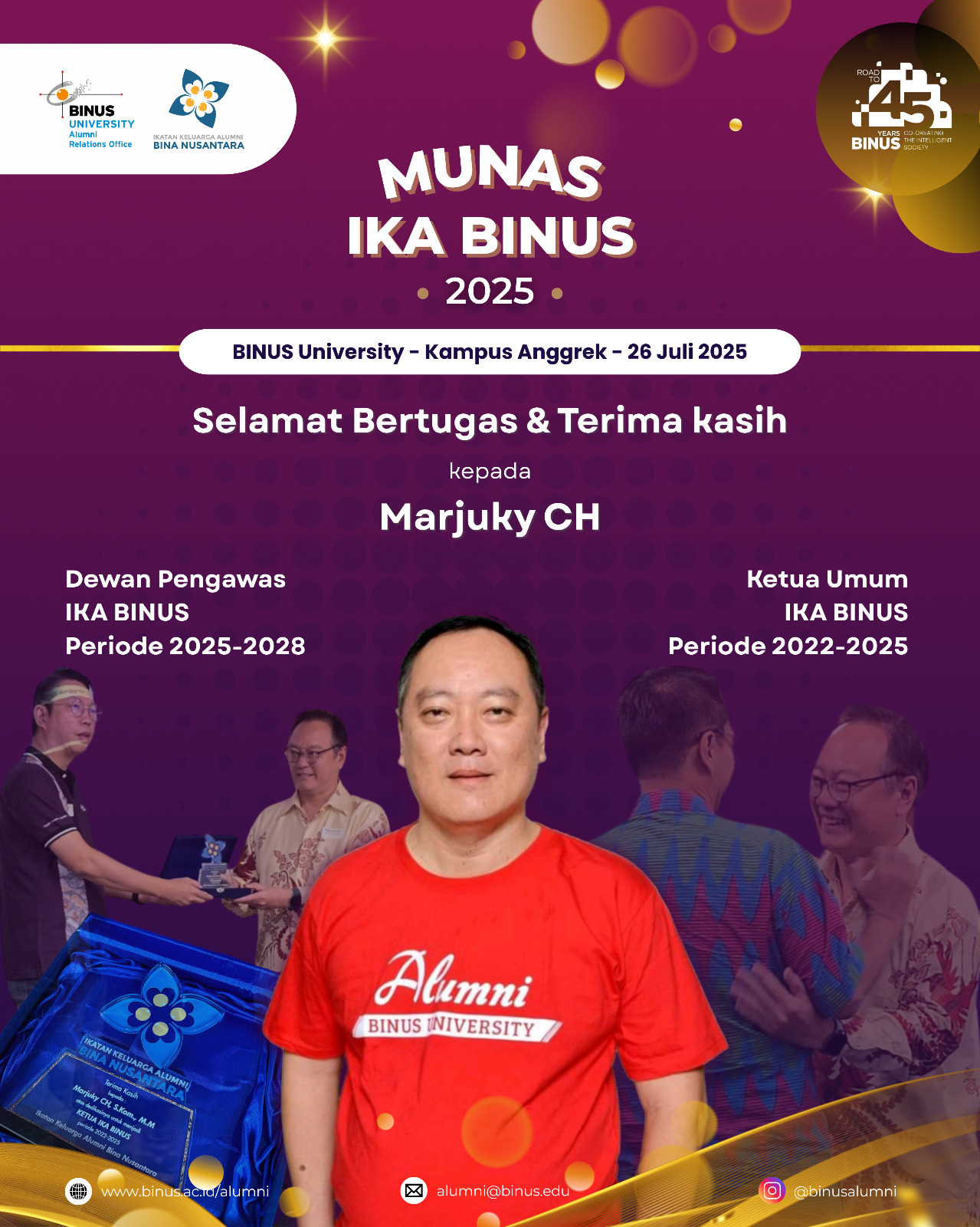 Kami mengucapkan terima kasih yang sebesar-besarnya kepada Bapak Marjuky CH atas dedikasi, kontribusi, dan semangat luar biasa selama menjabat sebagai Ketua Umum IKA BINUS Periode 2022–2025.