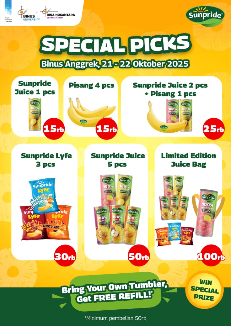 Saatnya refill energi kamu di Sunpride Juice Bar, hadir langsung di Lobby BINUS Anggrek (Tangga Titanic, West Lobby)!