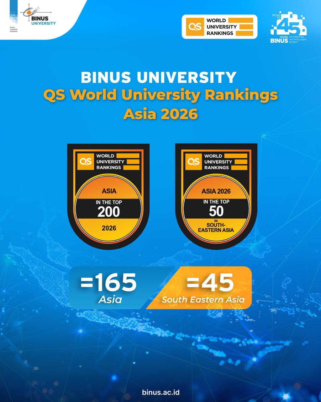Dalam QS World University Rankings: Asia 2026, BINUS University naik peringkat dan kini berada di posisi =165 di Asia dan =45 di Asia Tenggara.