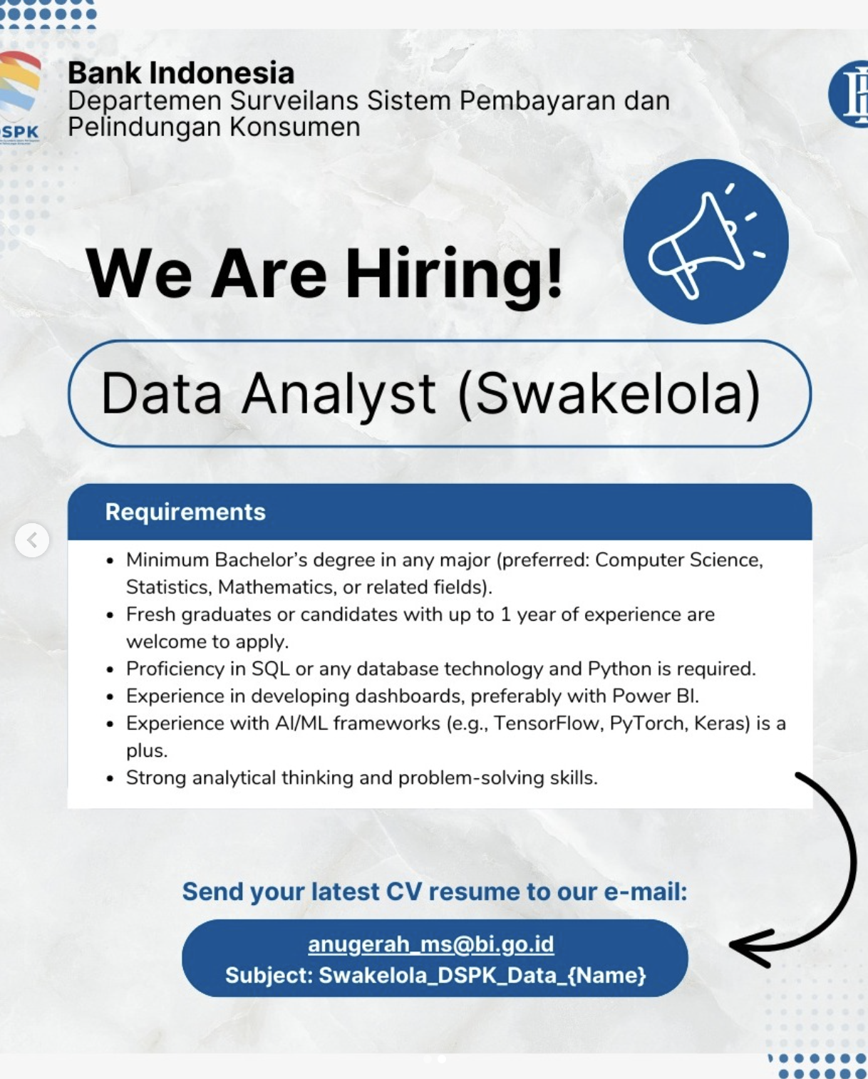 Bank Indonesia melalui Departemen Surveilans Sistem Pembayaran dan Pelindungan Konsumen (DSPK) membuka kesempatan bergabung sebagai Data Analyst (Swakelola).