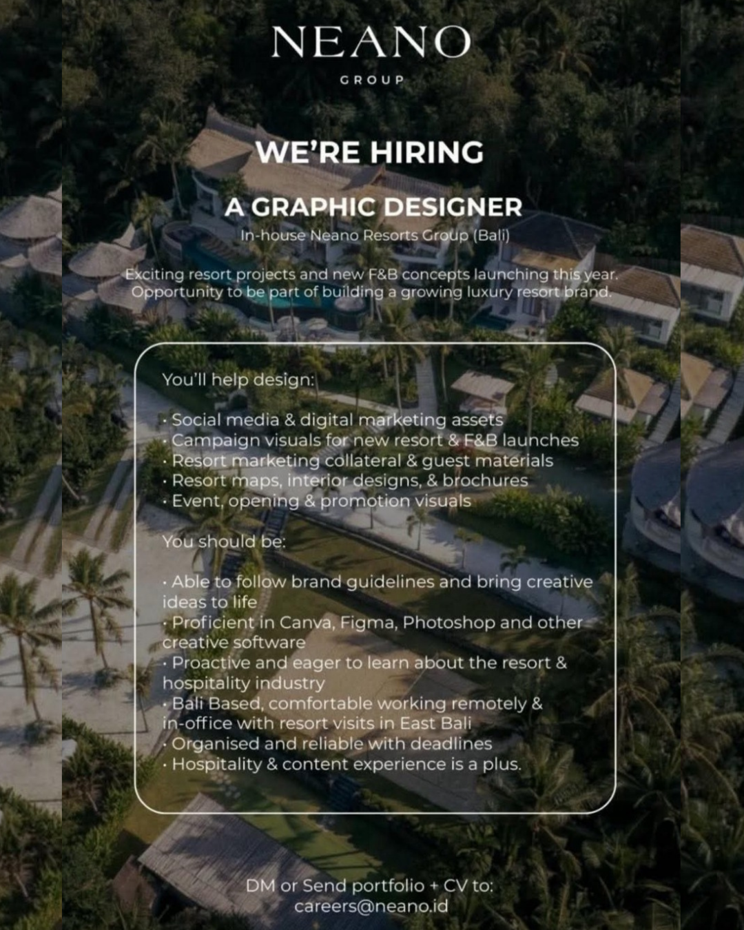 We’re hiring an In-house Graphic Designer to help Neano Group take over the Bali resort scene. If you’re proactive, love the hospitality vibe, and can turn brand guidelines into magic, we want YOU.