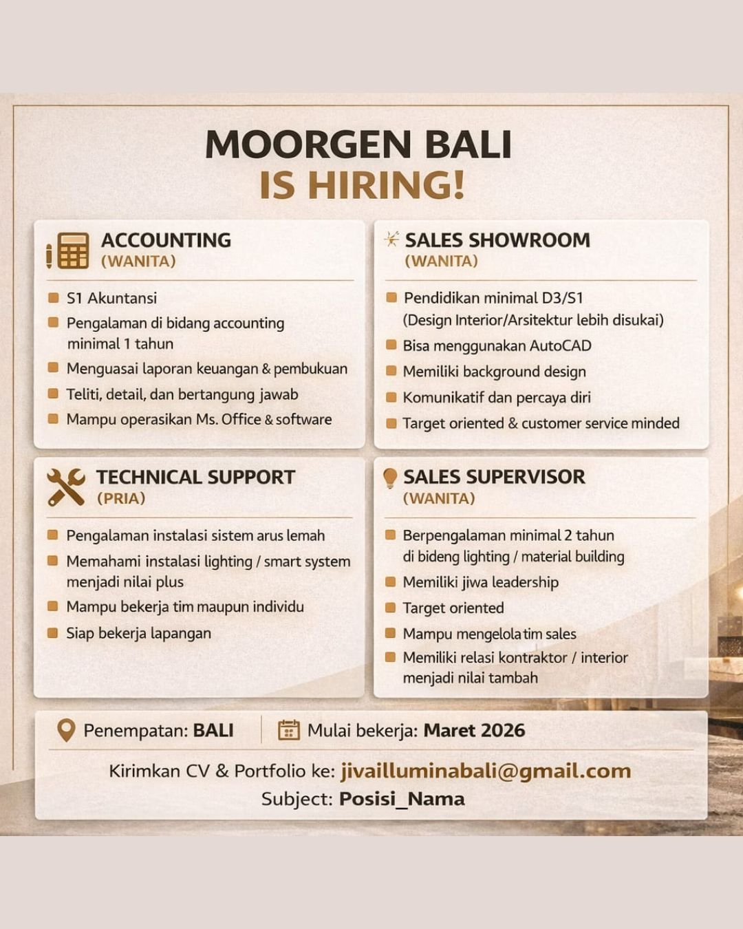 Kirim CV & Portfolio ke: jivailluminabali@gmail.com