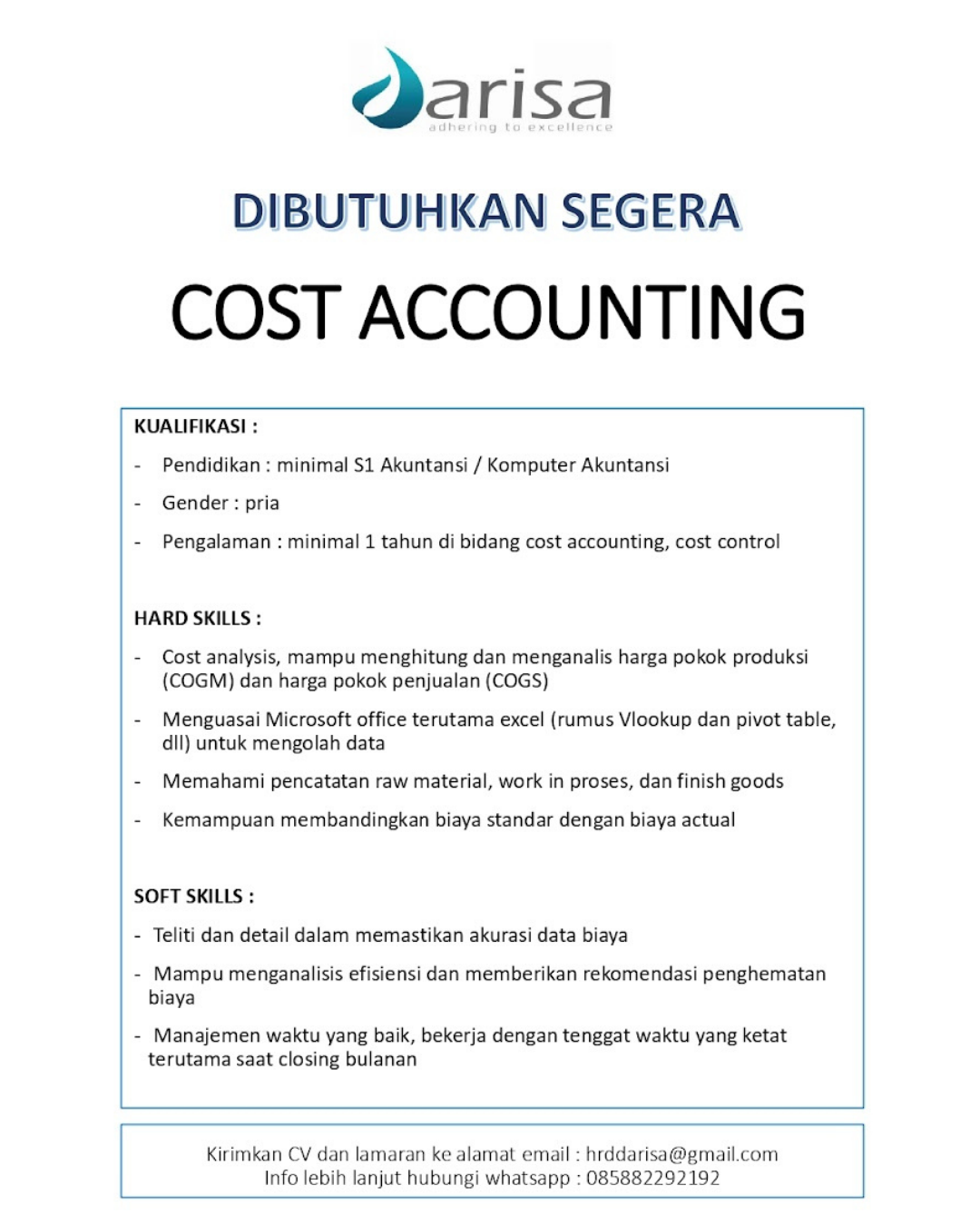 ?? Kirim CV ke: hrddarisa@gmail.com
