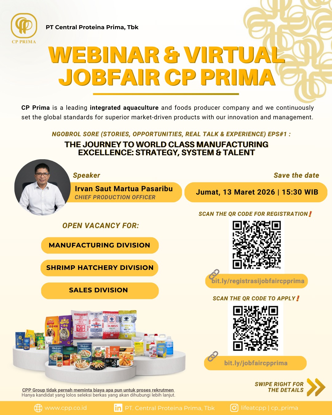 Sejalan dengan komitmen tersebut, Virtual Job Fair CP Prima 2026 dihadirkan sebagai ruang untuk membuka peluang karier sekaligus berbagi insight dan pengalaman industri melalui sesi webinar insightful lewat sesi Ngobrol Sore (Stories, Opportunities, Real Talk & Experience) – Eps #1.