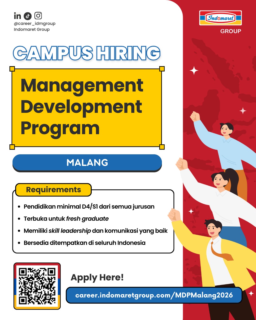 Halo jobseeker Malang dan sekitarnya, Indomaret Group akan segera datang ke kotamu untuk mengadakan Campus Hiring di tanggal 3 sampai 4 Maret 2026.