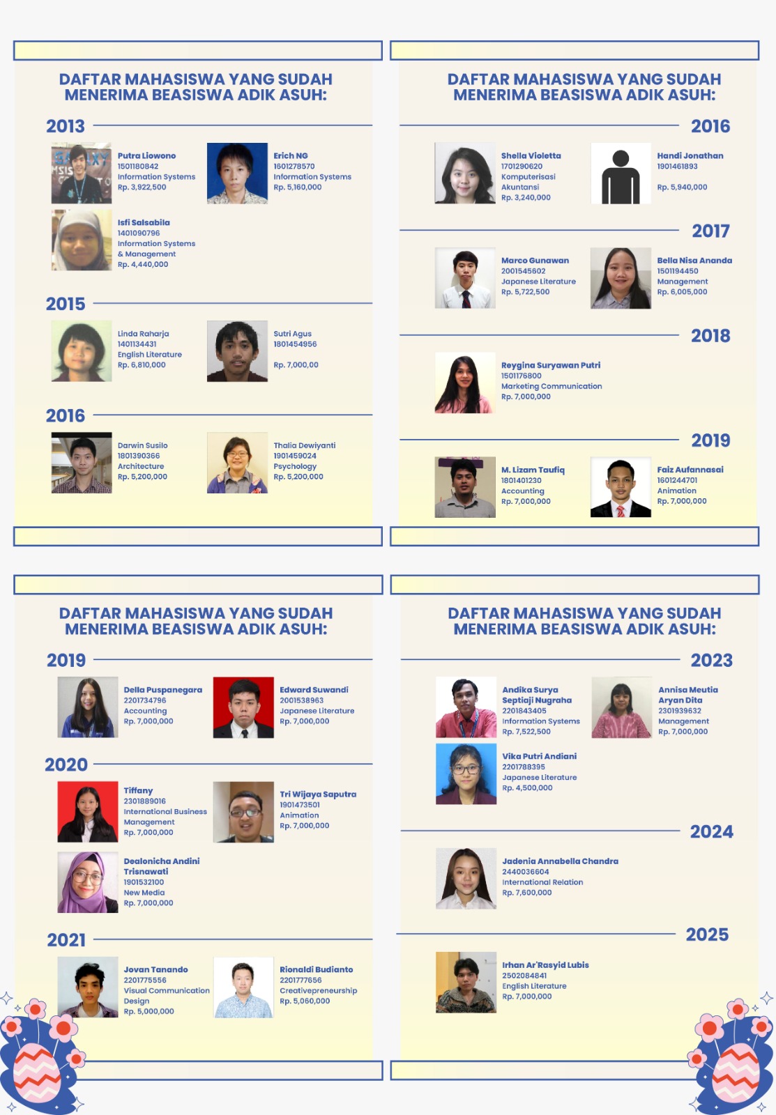 Terima kasih yang sebesar-besarnya kepada seluruh Alumni BINUS yang telah senantiasa mendukung program ini. Kepedulian Anda telah berhasil mengantarkan banyak adik-adik mahasiswa meraih impian dan gelar sarjana mereka!