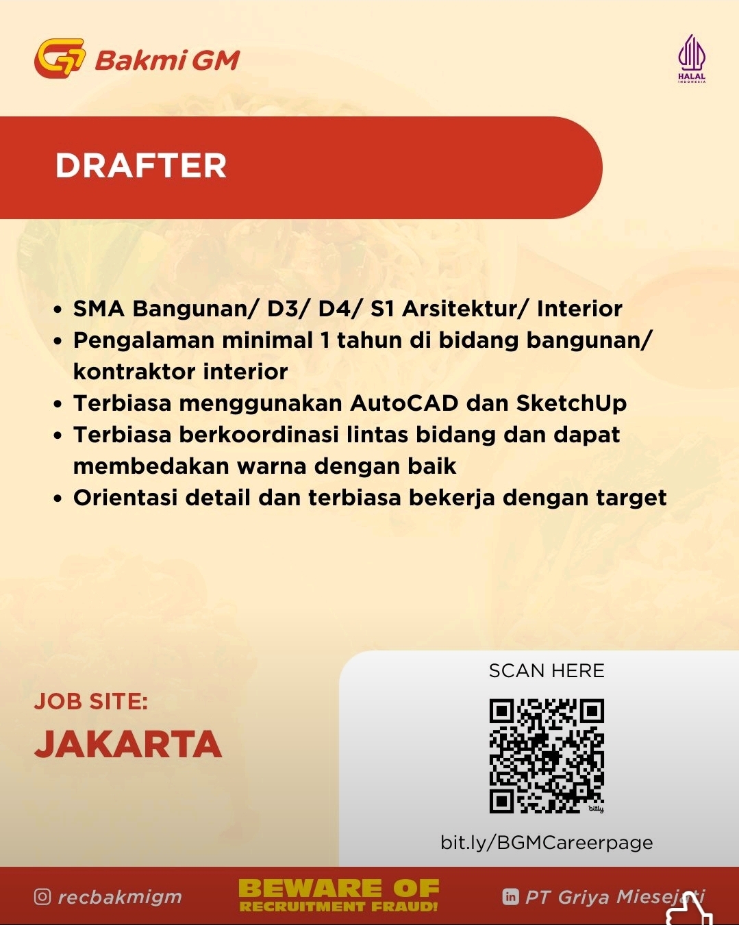 Kalau kamu punya passion di dunia arsitektur & interior, udah punya pengalaman minimal 2 tahun, dan fasih pakai AutoCAD, SketchUp, V-ray, sampai Photoshop — ini saatnya naik level bareng brand legendaris yang udah 50+ tahun menemani makan siang Indonesia.