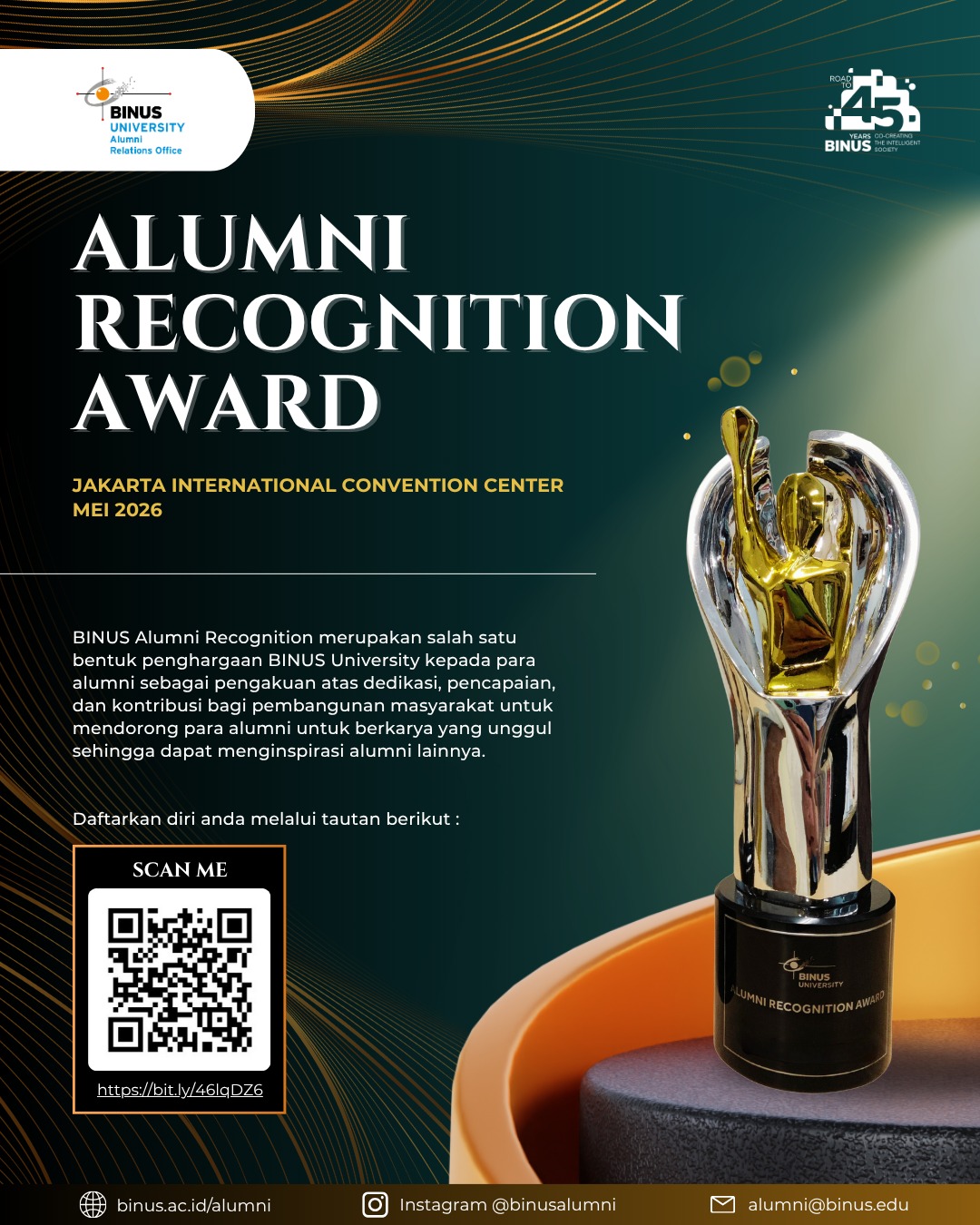 BINUS Alumni Recognition Award 2026 resmi dibuka — sebuah penghargaan untuk alumni BINUS yang telah menorehkan prestasi, membawa inovasi, dan memberikan dampak nyata bagi masyarakat serta almamater.