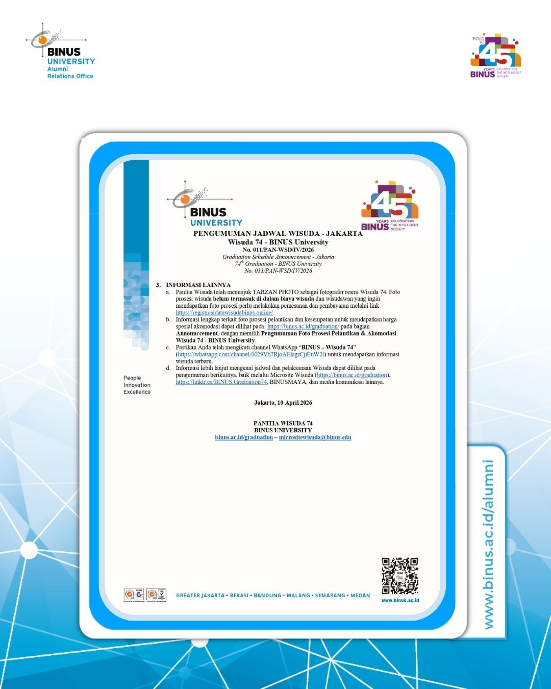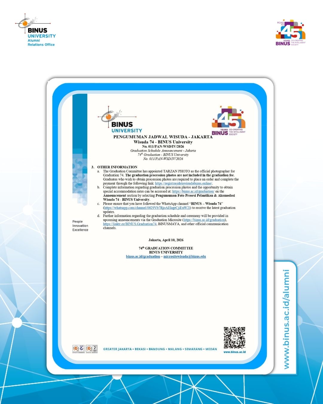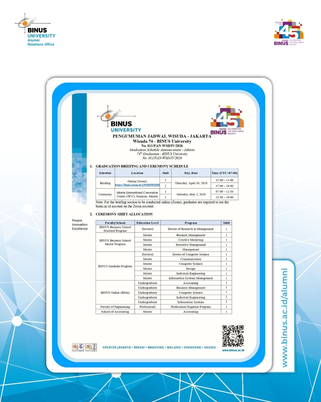 Hi Calon Wisudawan, berikut jadwal lengkap pelaksanaan Wisuda BINUS ke 74 :