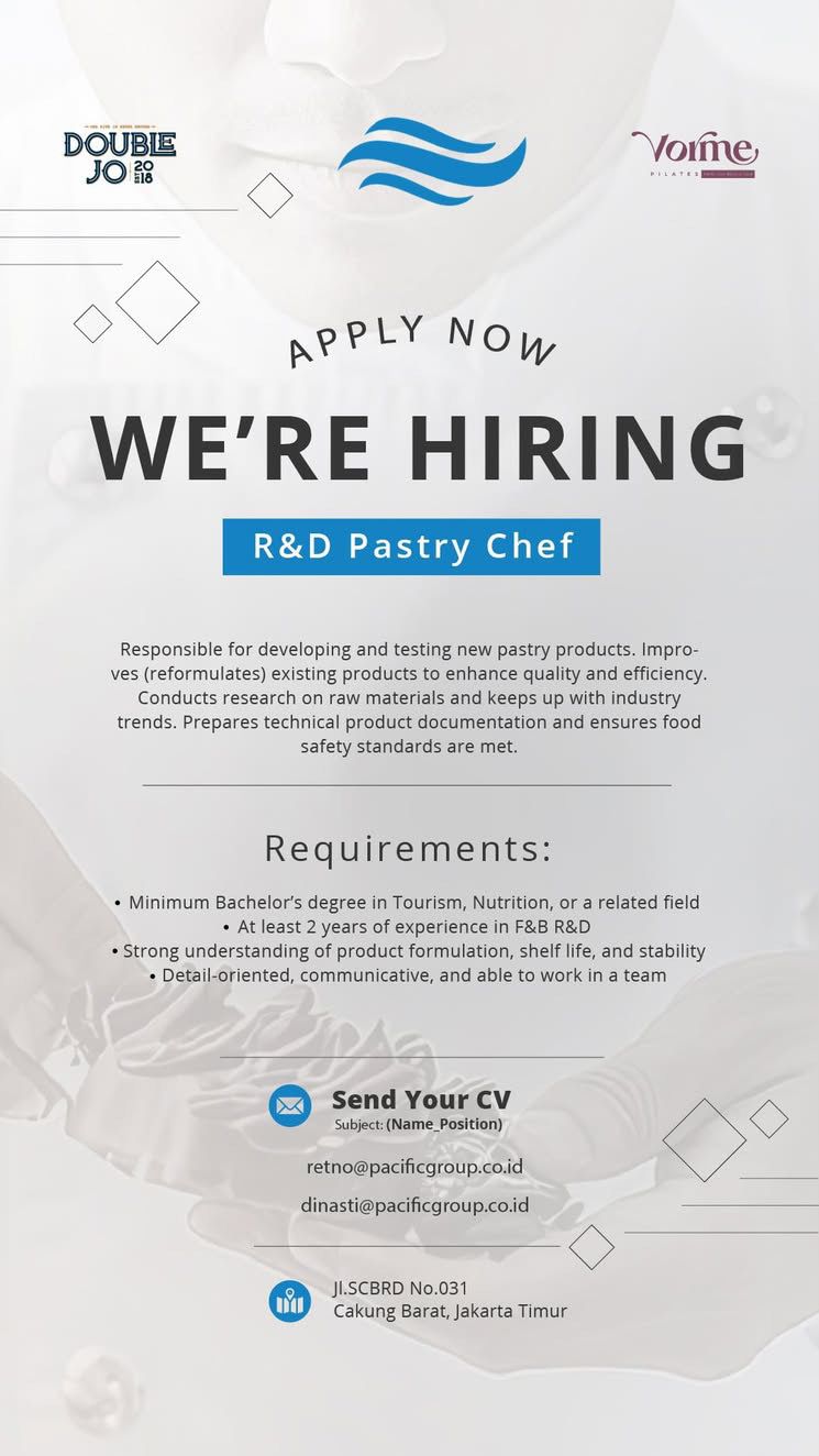 PT Pacific Niaga Pratama (Double Jo & Vorme Pilates) sedang mencari R&D Pastry Chef yang nggak cuma bisa bikin kue enak, tapi juga bisa menghadirkan inovasi di balik setiap gigitannya.