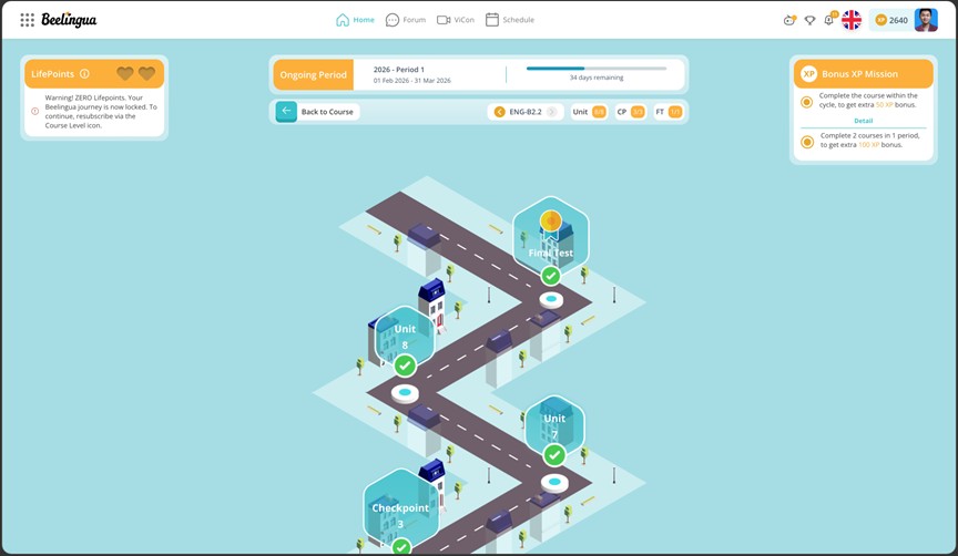 Jika mahasiswa gagal sebanyak dua kali dalam satu course, maka kesempatan Final Test pada course tersebut akan habis dan LifePoint yang digunakan akan dianggap terpakai sepenuhnya. Dengan kata lain, mahasiswa perlu memastikan kesiapan sebelum mencoba kembali, karena setiap percobaan memiliki konsekuensi terhadap penggunaan LifePoint dalam sistem Beelingua.