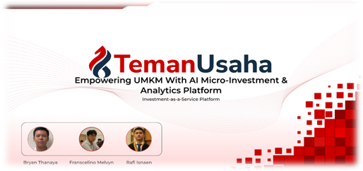 Inovasi yang mereka usung bernama TemanUsaha, sebuah aplikasi dengan moto “Empowering UMKM With AI Micro-Investment & Analytics Platform”. Aplikasi ini dirancang untuk membantu UMKM mendapatkan akses pendanaan dengan cara yang lebih modern dan aman. Melalui konsep Investment-as-a-Service, TemanUsaha menghubungkan investor kecil dengan pelaku usaha lokal. Investor bisa memberikan modal secara mikro, sementara pelaku usaha dapat memperoleh dana tanpa proses rumit. Konsep ini menjembatani kesenjangan dunia keuangan digital dan rakyat kecil.