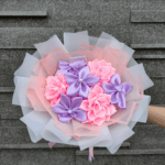 Terdiri dari 3 bunga dahlia dan 4 bunga plumeria yang dibuat menggunakan pita satin.