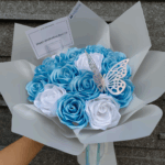 Terdiri dari 15 bunga mawar yang terbuat dari pita satin dan 1 kupu-kupu hologram.