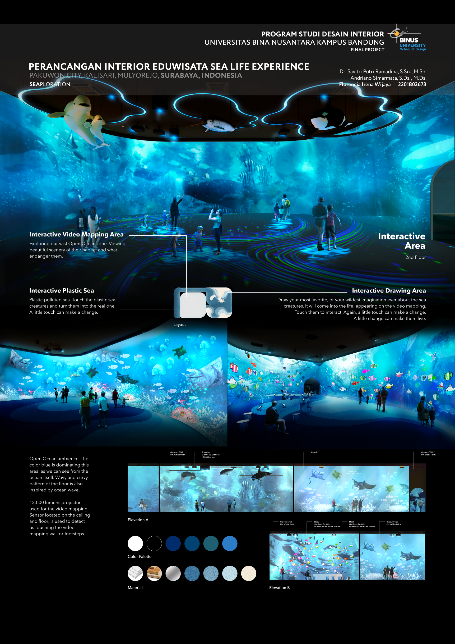 SEAploration berarti edukasi kehidupan laut melalui ekshibisi interaktif dan imersif yang memungkinkan pengunjung untuk bereksplorasi dan berinteraksi dengan instalasi yang ada sehingga pengunjung mendapatkan pengalaman baru. Penerapan interaktif pada ruang yaitu membuat obyek ekshibisi yang memberikan respon atau timbal balik setelah pengunjung melakukan aksi. Dalam hal ini, dibuat ekshibisi menggunakan video mapping dengan sensor, di mana akan muncul efek pada video ketika pengunjung menyentuh panel video mapping. Selain itu, dibuat display obyek pamer dengan informasi yang interaktif menggunakan tablet atau menggunakan tombol untuk memunculkan efek tertentu pada obyek. Penerapan imersif pada ruang yaitu membuat pengunjung dapat merasakan suasana bawah laut dan terlibat dalam interaksi dengan lingkungan sekitarnya, terutama dengan obyek ekshibisi dan video mapping. Penerapan eksploratif pada ruang yaitu memberikan pengalaman baru bagi pengunjung melalui ekshibisi interaktif. Penerapan laut pada ruang yaitu menggunakan warna, bentuk, dan sifat air dan komponen laut lainnya pada desain. Selain itu, kehidupan laut merupakan konten ekshibisi pada perancangan Sea Life Experience.