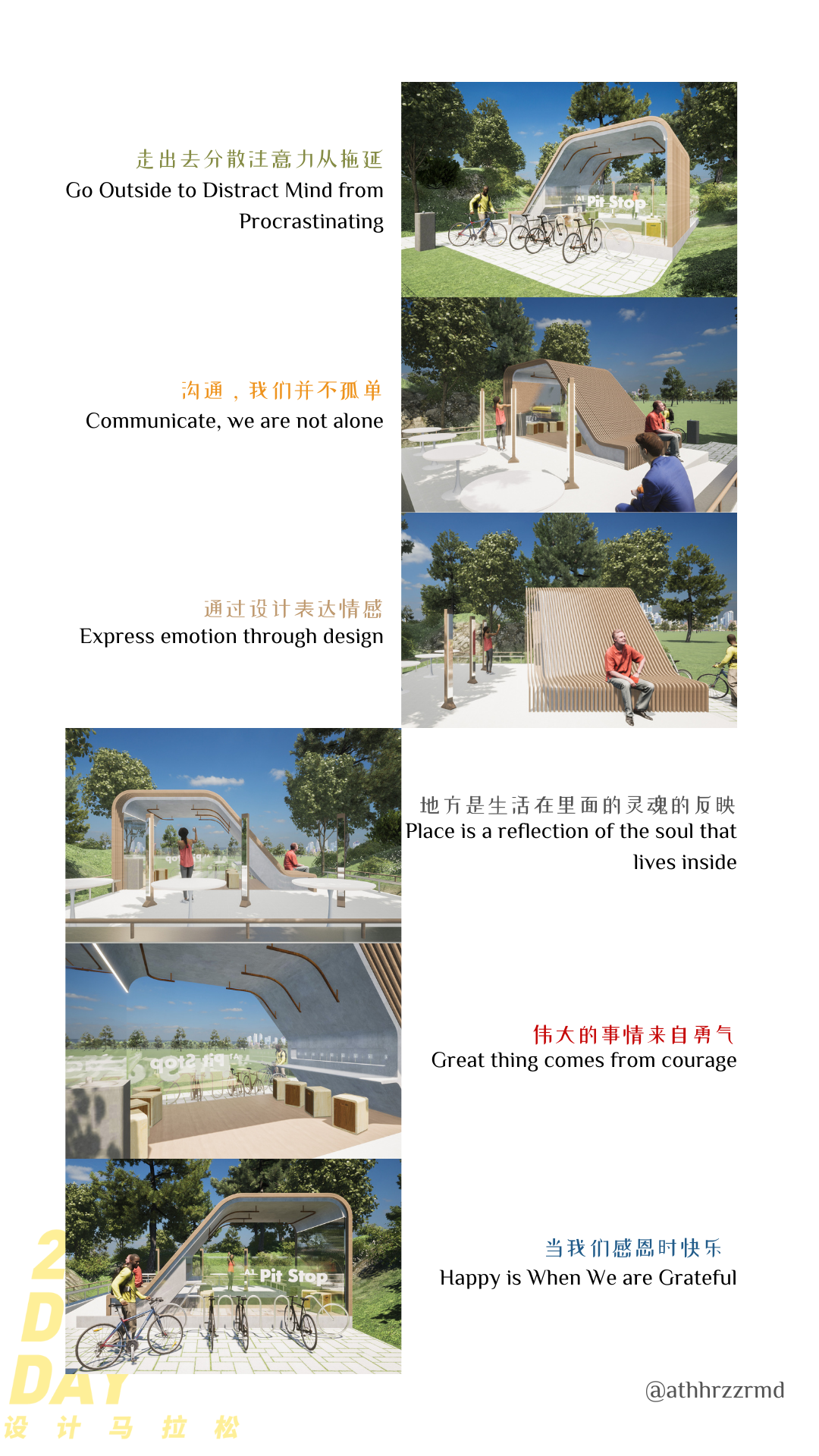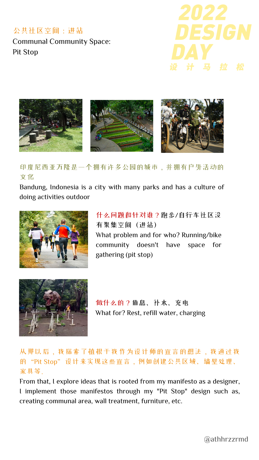 By 2030, Provide universal access to safe, inclusive, and accessible, green and public spaces, in particular for women and children, older persons, and persons with disabilities. Bandung, Indonesia is a city with many parks and a culture of outdoor activities. From that, I explore ideas that are rooted in my manifesto as a designer. I implement those manifestos through my “Pit Stop” design such as; creating communal areas, wall treatment, furniture, etc.