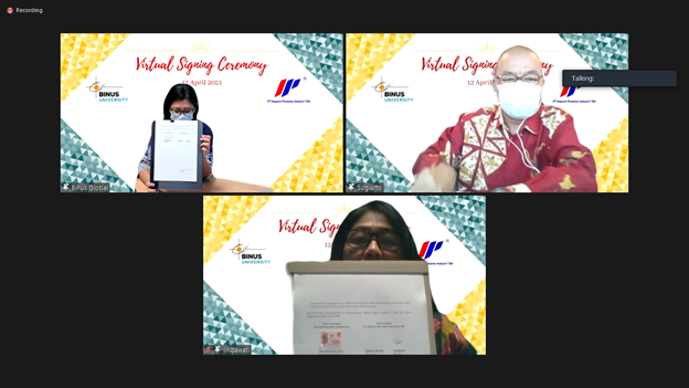 Senin, 12 April 2021 – BINUS UNIVERSITY diwakili oleh BINUS GLOBAL menyelenggarakan seremoni penandatanganan kerja sama dengan PT Impack Pratama Industri Tbk. secara virtual pada Senin, 12 April 2021. Di tengah kondisi pandemi tidak mengurangi semangat kolaborasi positif antara BINUS UNIVERSITY dengan PT Impack Pratama Industri Tbk. dalam menciptakan produk yang inovatif yang dapat berguna bagi community, yaitu masyarakat Indonesia. Seremoni ini dihadiri oleh tim dari BINUS GLOBAL yaitu Dr. Diah Wihardini selaku Direktur BINUS GLOBAL dan dua orang Direktur dari PT Impack Pratama Industri Tbk. Bapak Sugiarto Romeli dan Ibu Lindawati, serta Head of Corporate Secretary & legal Ibu Lenggana Linggawati.