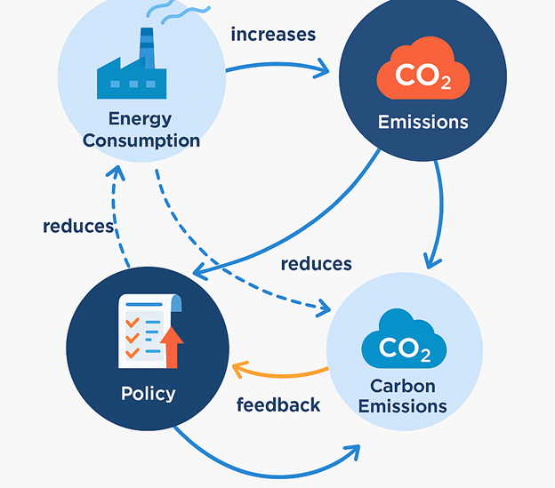 Gambar 1. Ilustrasi sederhana hubungan dinamis antara kebijakan, konsumsi energi, dan emisi karbon. (Disclaimer: This image is AI-generated using DALL·E)