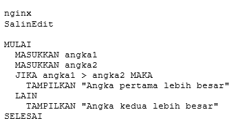 Berikut adalah contoh pseudocode sederhana untuk menentukan angka terbesar dari dua angka: