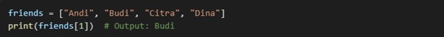Contoh: Kalau kita punya daftar nama teman-teman, kita bisa simpan di dalam array seperti ini: