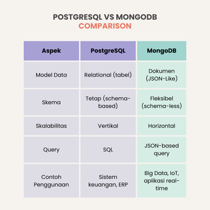 Dalam era transformasi digital, data menjadi aset strategis bagi organisasi. Keputusan dalam memilih sistem manajemen basis data (DBMS) yang tepat menjadi salah satu faktor penting dalam mendukung performa aplikasi, skalabilitas, hingga analitik. Dua teknologi yang sering dibandingkan adalah NoSQL (MongoDB) dan SQL (PostgreSQL). Masing-masing memiliki kelebihan, kekurangan, dan skenario penggunaan yang berbeda.