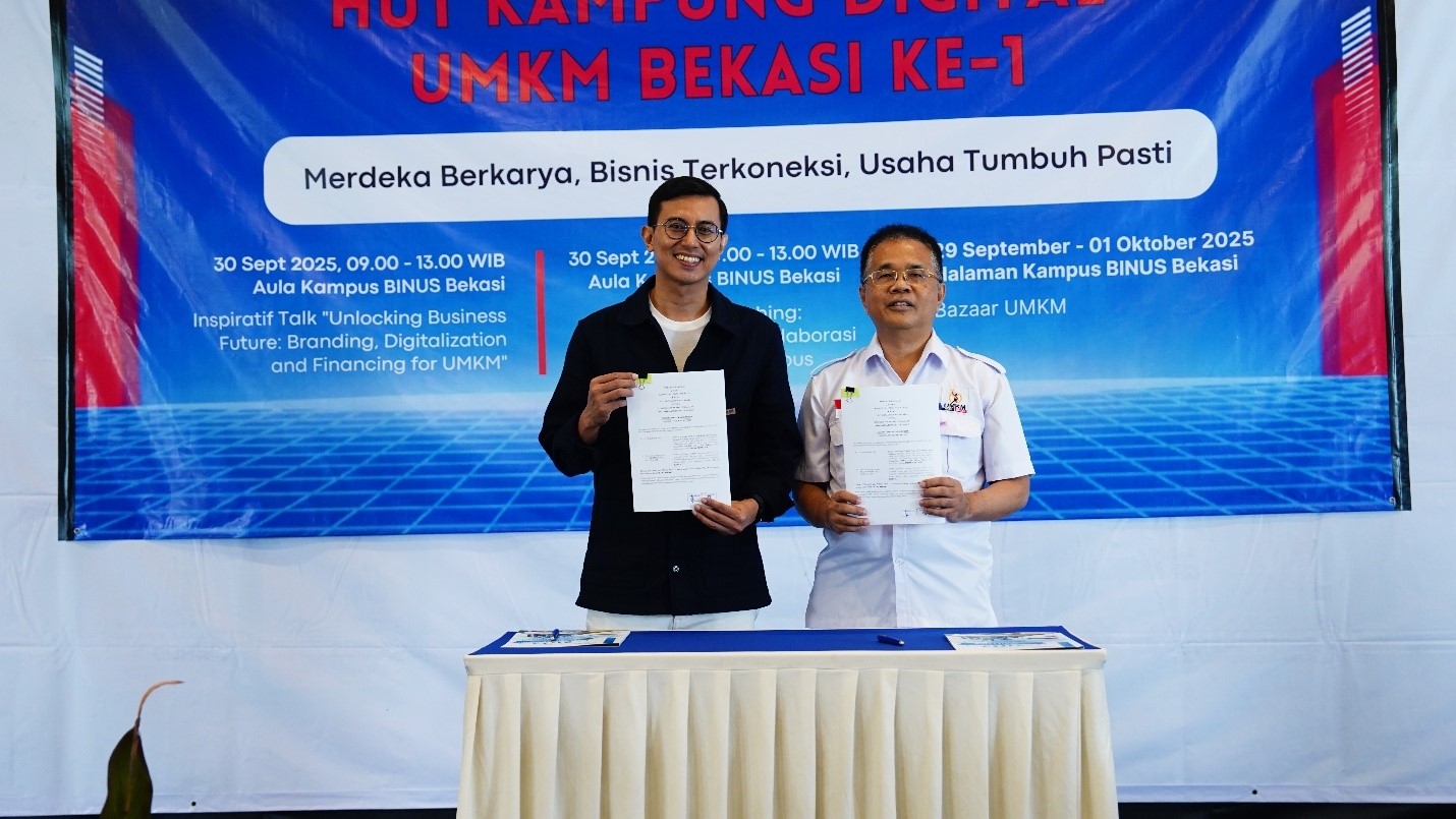 Puncak acara ini terdapat pada seremonial penandatanganan MoU UMKM Naik Kelas oleh Prof. Gatot Soepriyanto selaku Campus Director BINUS @Bekasi bersama Ir. Dody Royen sebagai Ketua UNK & Kampung Digital UMKM Bekasi. Penandatanganan ini menjadi simbol nyata komitmen bersama dalam memperkuat peran UMKM melalui literasi digital, peningkatan kapasitas usaha, serta perluasan jejaring kolaborasi. Kerja sama ini diharapkan dapat membuka peluang sinergi strategis antara dunia akademik dan komunitas UMKM, sehingga tercipta ekosistem yang saling mendukung.