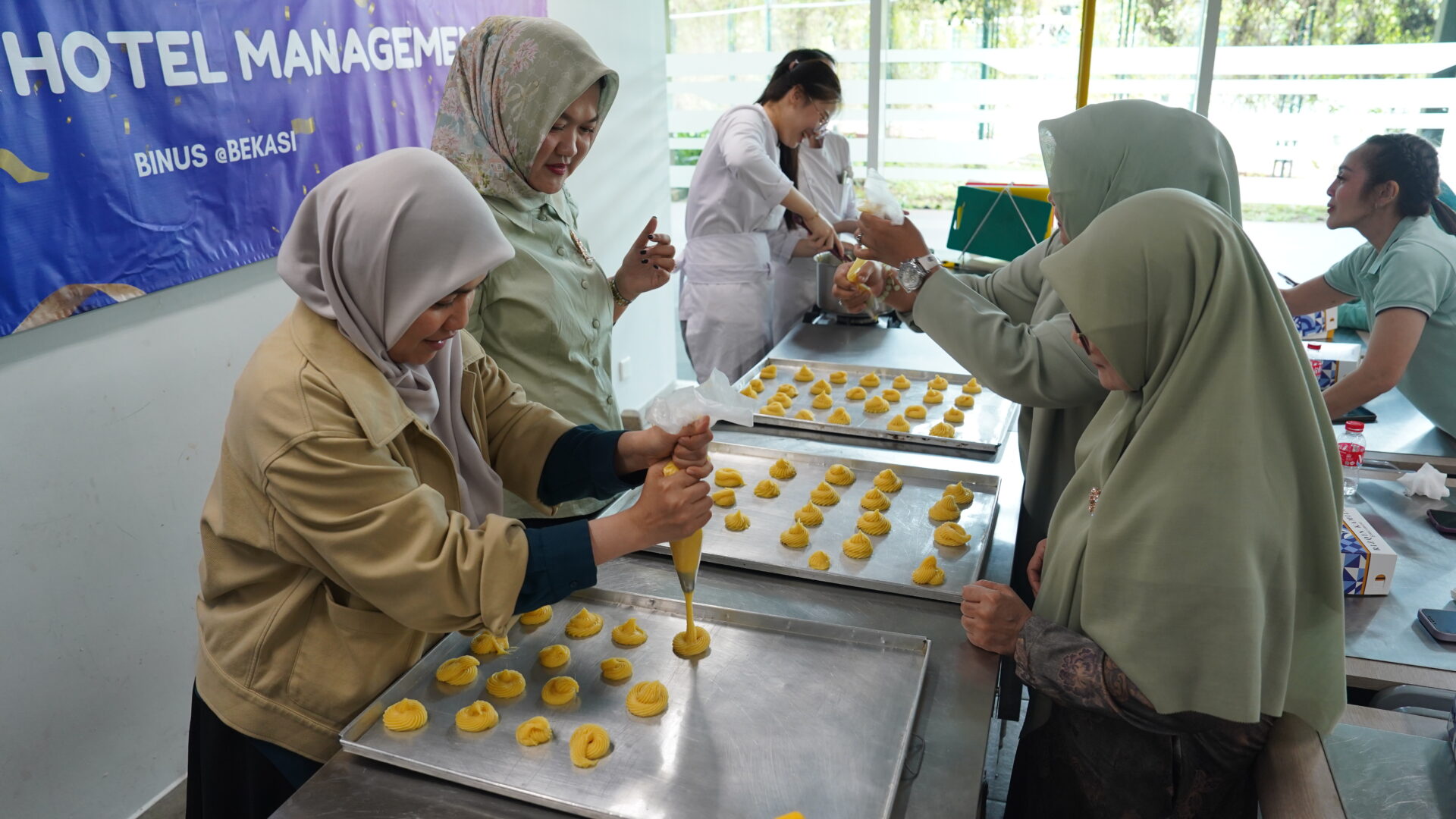 Rangkaian kegiatan diawali dengan pelatihan pembuatan pastry, di mana para peserta dibimbing secara langsung oleh dosen dari Business Hotel Management BINUS @Bekasi. Pada sesi ini, peserta mempelajari teknik dasar pembuatan pastry, mulai dari pengolahan bahan, proses pemanggangan, hingga penyajian yang menarik dan sesuai standar. Selain itu, peserta juga mendapatkan penjelasan mengenai pentingnya kebersihan, ketepatan takaran, dan konsistensi rasa dalam setiap hidangan yang disajikan.