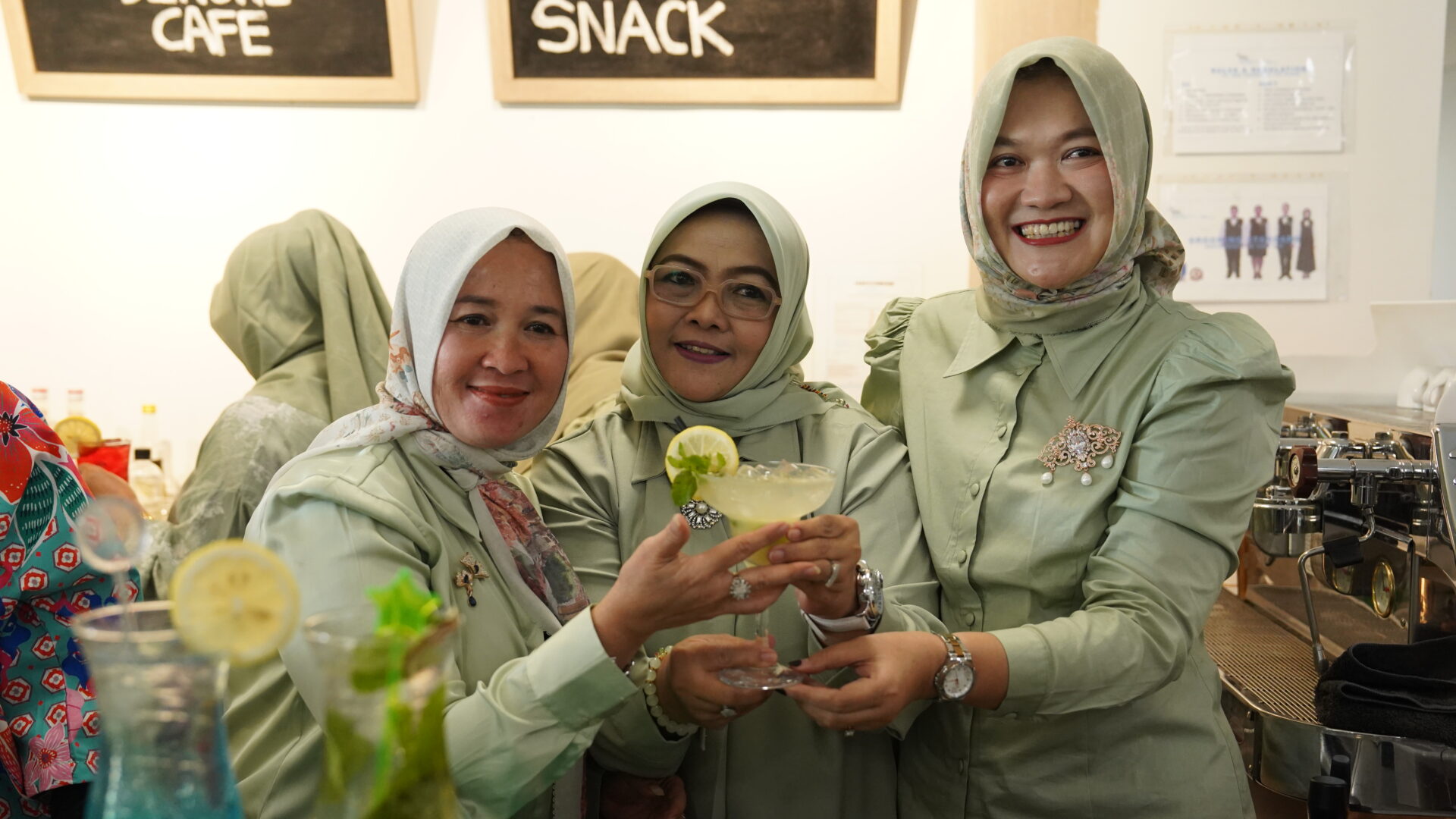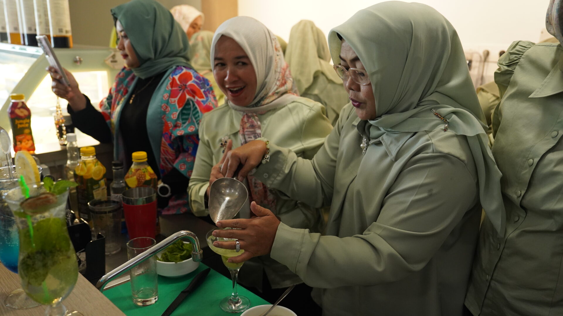 Setelah sesi pastry, kegiatan dilanjutkan dengan pelatihan pembuatan mocktail sebagai pelengkap konsep high tea. Peserta diajak mengenal berbagai kombinasi bahan minuman non-alkohol, teknik pencampuran yang tepat, serta cara penyajian mocktail yang menarik secara visual. Sesi ini memberikan pengalaman baru bagi peserta untuk mengeksplorasi kreativitas sekaligus memahami tren minuman yang banyak digunakan dalam industri perhotelan dan acara formal.