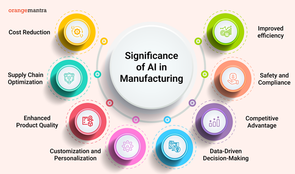 Gambar 2: Berbagai aplikasi AI dalam sektor manufaktur modern. Sumber: OrangeMantra