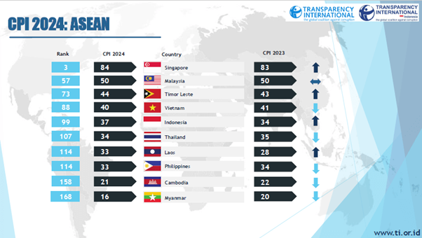 - Transparency International. “2024 Corruption Perceptions Index: Countries on Front Line of Climate Crisis in Asia Pacific Struggling to Fight Back Corruption.” Transparency International, 11 Februari 2025. https://www.transparency.org/en/press/2024-corruption-perceptions-index-countries-on-front-line-of-climate-crisis-in-asia-pacific-struggling-to-fight-back-corruption.
