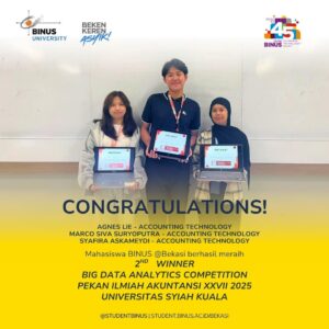 Prestasi membanggakan berupa meraih Juara Kedua dalam Kompetisi Big Data Analytics pada ajang Pekan Ilmiah Akuntansi (PIA) XXVII Tahun 2025 yang diselenggarakan oleh Universitas Syiah Kuala menjadi bukti nyata kemampuan mahasiswa Accounting Technology BINUS @Bekasi dalam mengaplikasikan ilmu yang diperoleh di bangku kuliah ke dalam praktik nyata.
