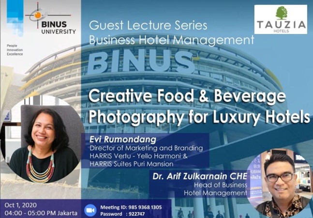 Program studi Business Hotel Management Universitas Bina Nusantara mengadakan Guest Lecture Webinar dengan tema “Creative Food and Beverage Photography” pada Kamis, 1 Oktober 2020 via Zoom meeting. Narasumber utama pada webinar ini yaitu Ibu Evi Rumodang selaku Director of Marketing and Branding HARRIS Vertu- Yello Harmoni dan HARRIS Suites Puri Mansion Jakarta. Kegiatan ini ditujukan khusus untuk mahasiswa Business Hotel Management Binus Bekasi sebagai pembekalan dengan objektif untuk menambah pengetahuan mahasiswa dari praktisi hotel mengenai perkembangan industri perhotelan dan pariwisata.