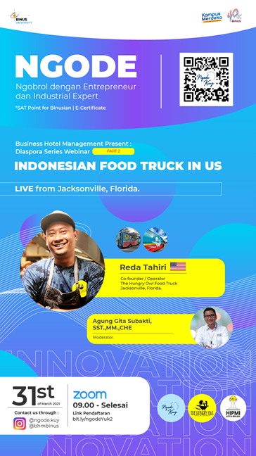 Program Business Hotel Management Universitas Bina Nusantara mengadakan sesi Webinar dengan narasumber yang merupakan diaspora di luar negeri dengan topik “Indonesian Food Truck Entrepreneur in USA”. Narasumber adalah Bapak Reda Tahiri selaku pemilik The hUngry Owl Food Truck di kota Florida.