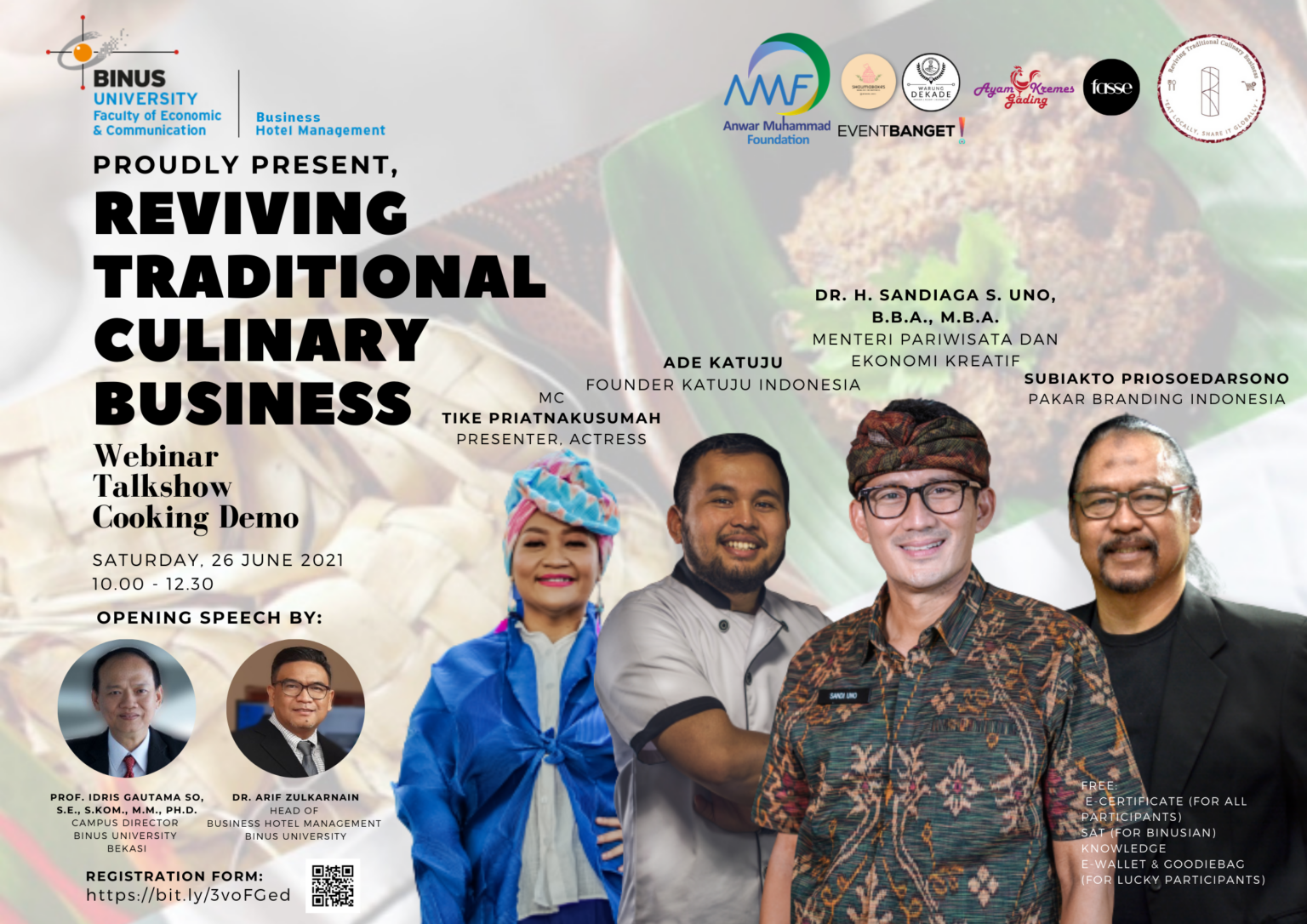 Sebagai pemenuhan mata kuliah Culinary Business Event, mahasiswa dan mahasiswi Manajemen Bisnis Hotel Universitas Bina Nusantara, pada tanggal 26 Juni 2021, diadakanlah Webinar Event yang memiliki topik ‘Reviving Traditional Culinary Business’.