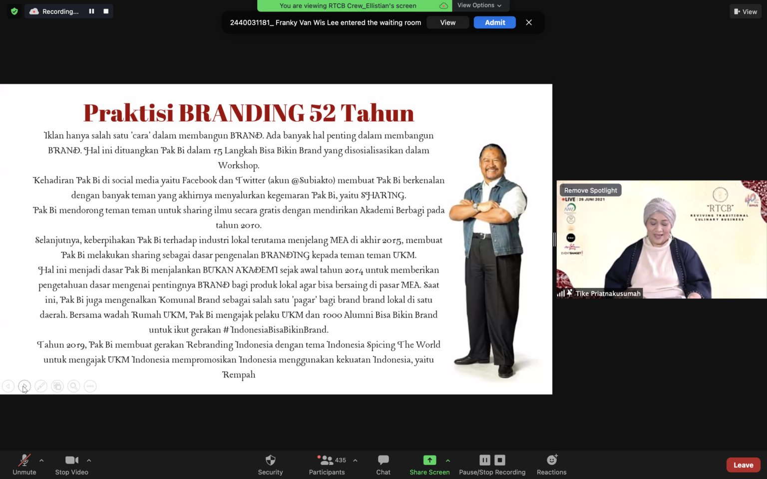 Dalam acara ini, menghadirkan 2 pembicara utama yaitu Bp. Subiakto sebagai Pakar Branding Indonesia dan Ade Katuju sebagai Founder dari Katuju Indonesia. Selain itu, acara ini juga menghadirkan Dr. H. Sandiagan Salahuddin Uno, B.B.A, M.B.A, sebagai pemberi kata-kata pembuka utama. Tak lupa, acara ini juga dipandu oleh Pembawa Acara ternama yaitu Tieke Priatnakusumah.