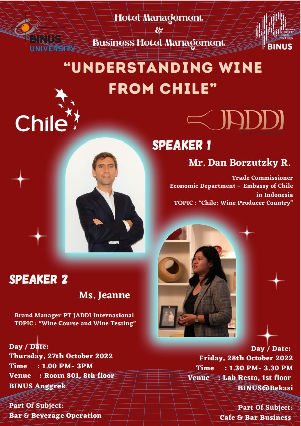 Still in the series of Guest Lecture Workshop ”Understanding Wine from Chile” on Friday 28th October 2022, Mr. Dan Borzutzky as Trade Commissioner from Embassy of Chile visited Business Hotel Management in Binus Bekasi with Ibu Jeanne as Brand Manager from PT JADDI, to continue sharing the knowledge of Chilean Wine. Ibu Maria Pia Adiati act as the host during the workshop, accompanied by Bapak Indra as the course lecturer.