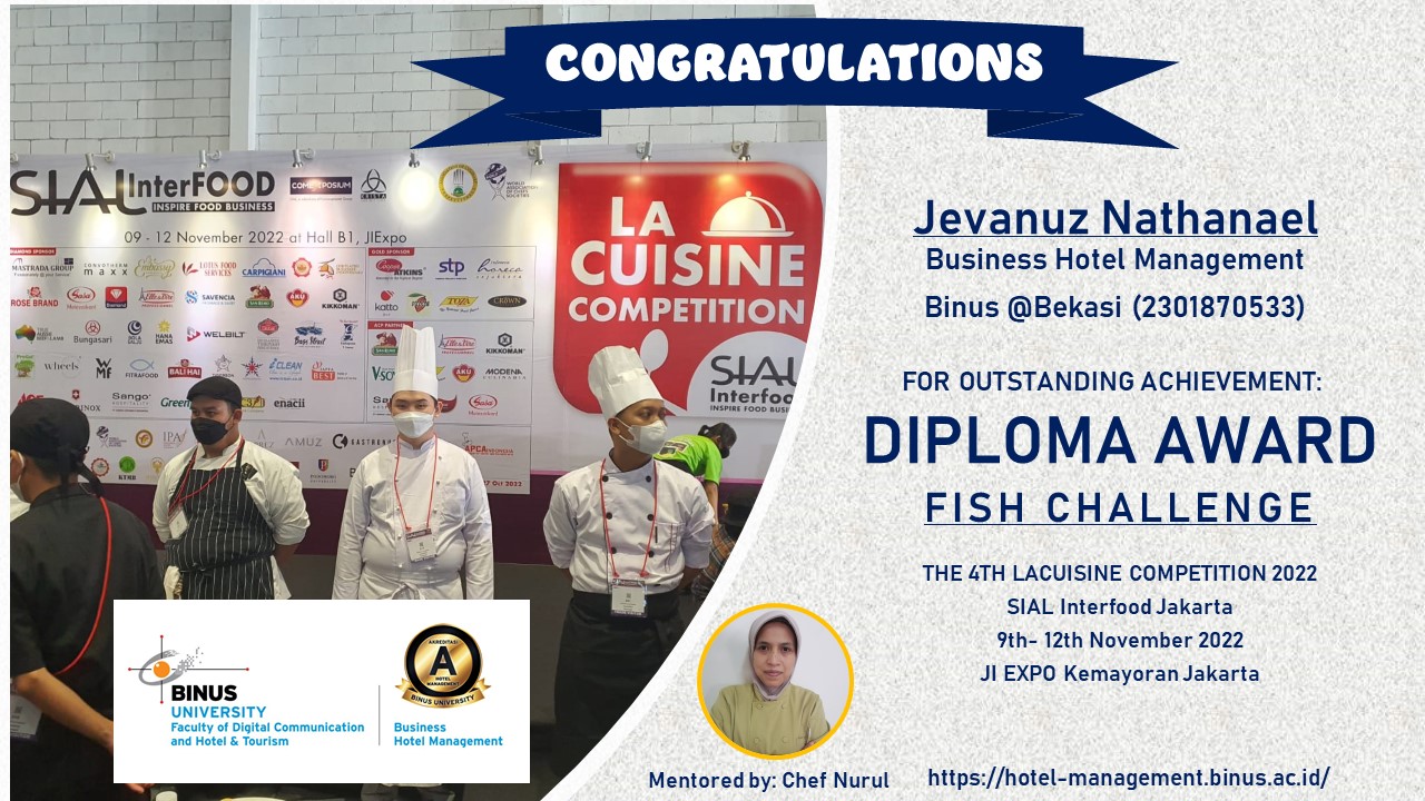 Mahasiswa Business Hotel Management BINUS@Bekasi Jevanuz Nathanael (2301870533) berhasil meraih DIPLOMA Award pada Class 14 Indonesia Spice Up The World – Fish Main Course pada ajang THE 4TH LACUISINE COMPETITION 2022 yang menajdi bagian dalam SIAL InterFOOD 2022 yang berlangsung di JI Expo Kemayoran pada 9- 12 November 2022.